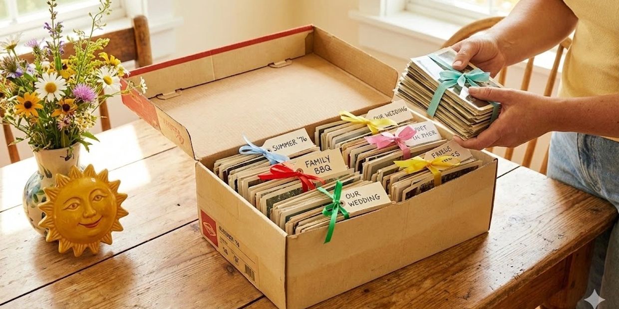 - The Index Card Strategy: The best way to organize is to group your photos by year, person, or event and place a simple index card in front of each stack (e.g., "Summer '85" or "The Wedding"). We can use these cards to name your digital folders, keeping your files organized from day one.